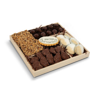 This 3-section wood tray is filled with a delectable assortment of Viennese bark, chocolate cookie pops, and indulgent chocolate truffles. A perfect gift for any chocolate lover!