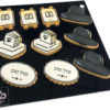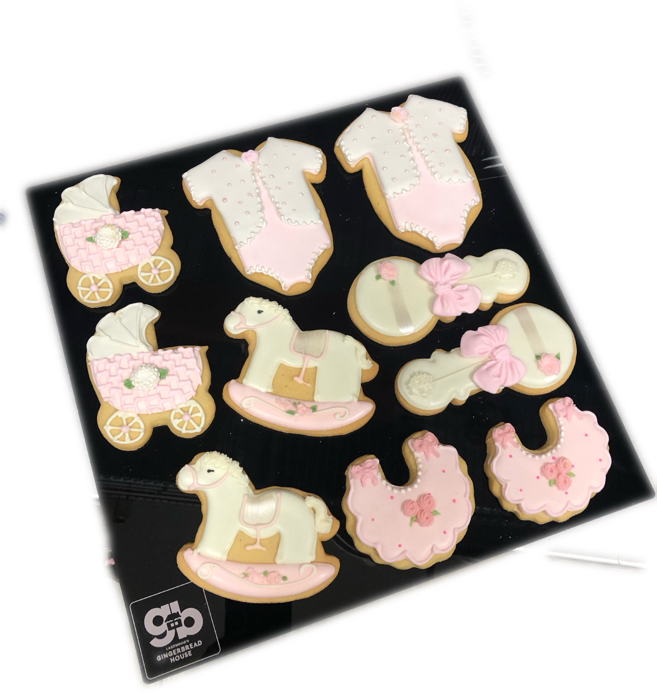 Celebrate the birth of a baby girl with this 12×12 black acrylic tray, featuring 10 assorted royal icing cookies shaped like bibs, rocking horses, rattles, baby blocks, and baby carriages. A sweet and thoughtful way to mark the special occasion! Assortment may vary based on availability.