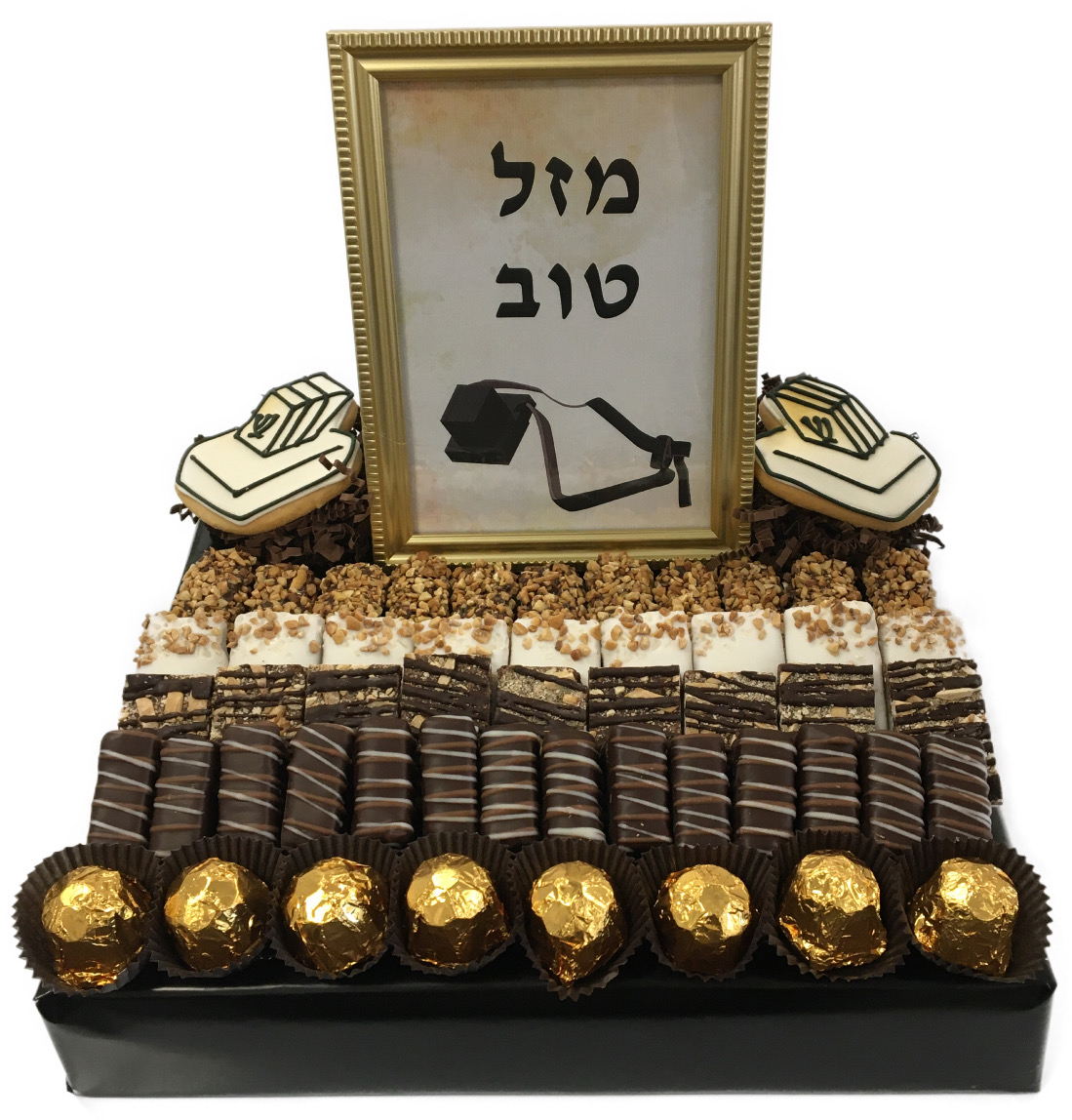 Large chocolate arrangement (12″x11″x11″)contains: Gold picture frame with Mazal Tov wishes for a bar mitzvah, assortment of chocolates and two tefillin cookies.