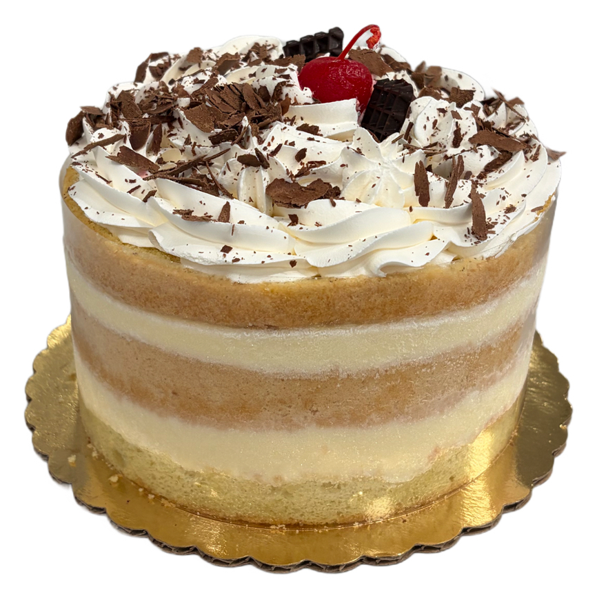 Indulge in a classic favorite reimagined. This Boston Cream Cake features soft, fluffy layers of white cake filled with smooth, velvety custard. The entire creation is finished with a generous swirl of non-dairy whip and crowned with a bright, festive cherry on top. The sides of the cake are left beautifully natural, showcasing its elegant layers and handcrafted charm. Perfect for celebrations—or simply treating yourself.