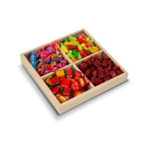 Car shaped wooden tray contains an assortment of candy. Perfect for your new driver.