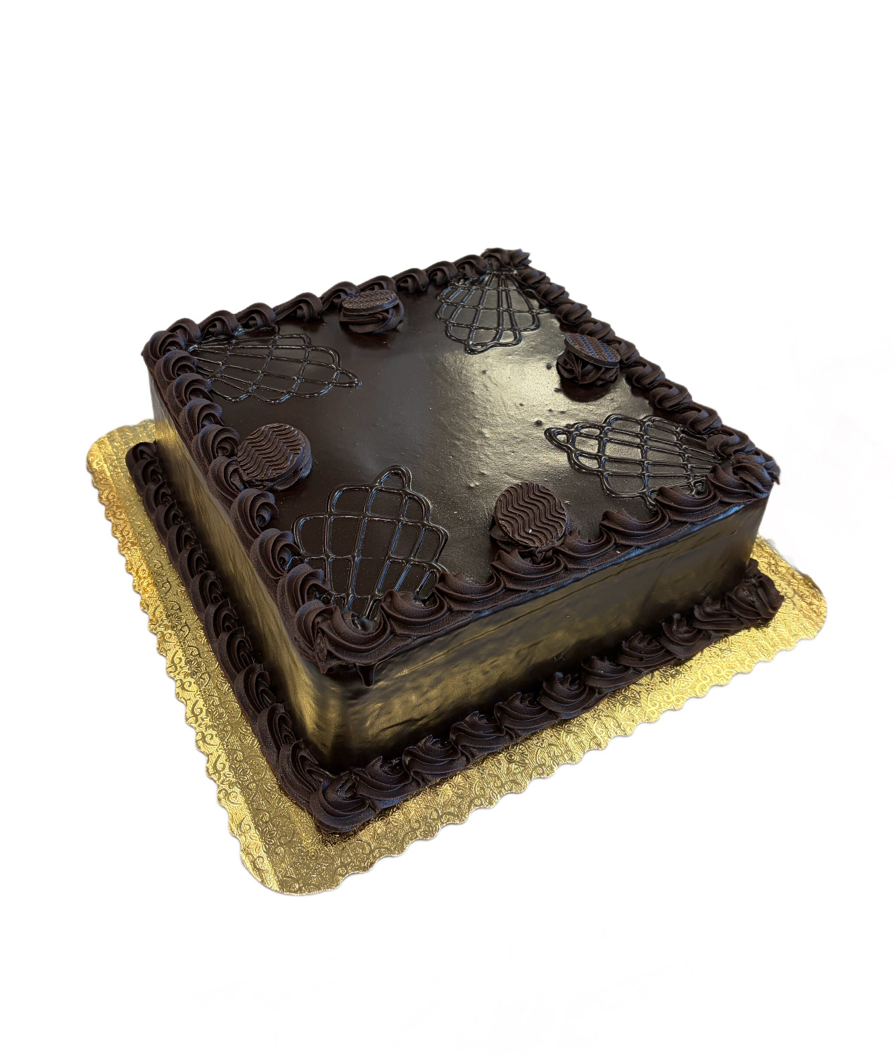 12×12 Square chocolate cake, chocolate mousse cream, ganache plus decorative top and sides. Please call or text the store to check stock availability before placing your order 732-370-7933×2.