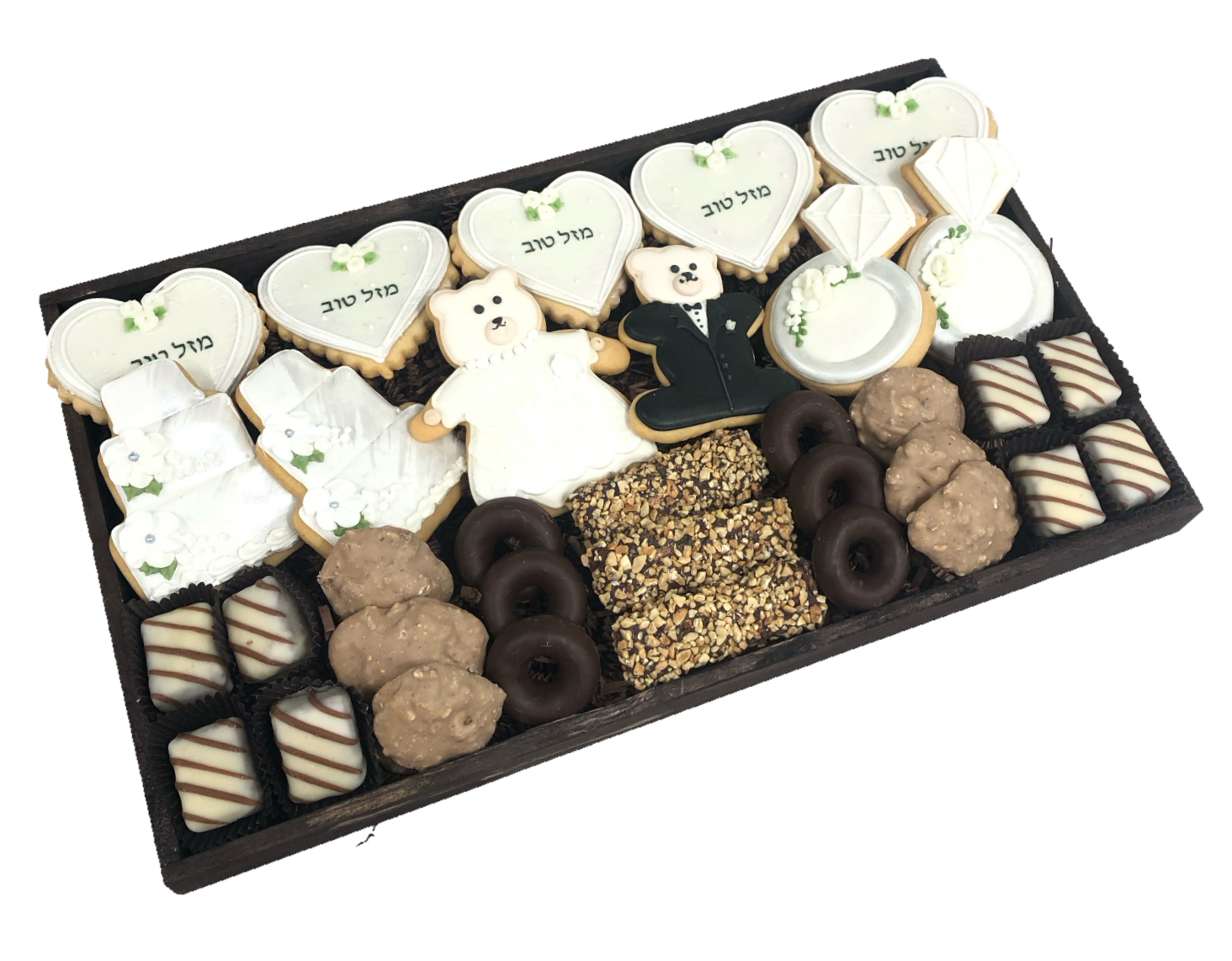 Celebrate the joy of a new couple with our Chosson/Kallah Cookie and Chocolate Platter. This beautifully arranged platter, measuring approximately 16″ x 10″, features large, intricately decorated cookies, along with rich, melt-in-your-mouth chocolates. Perfect for marking this exciting new chapter, it’s a sweet and thoughtful way to share in the celebration.