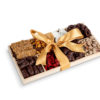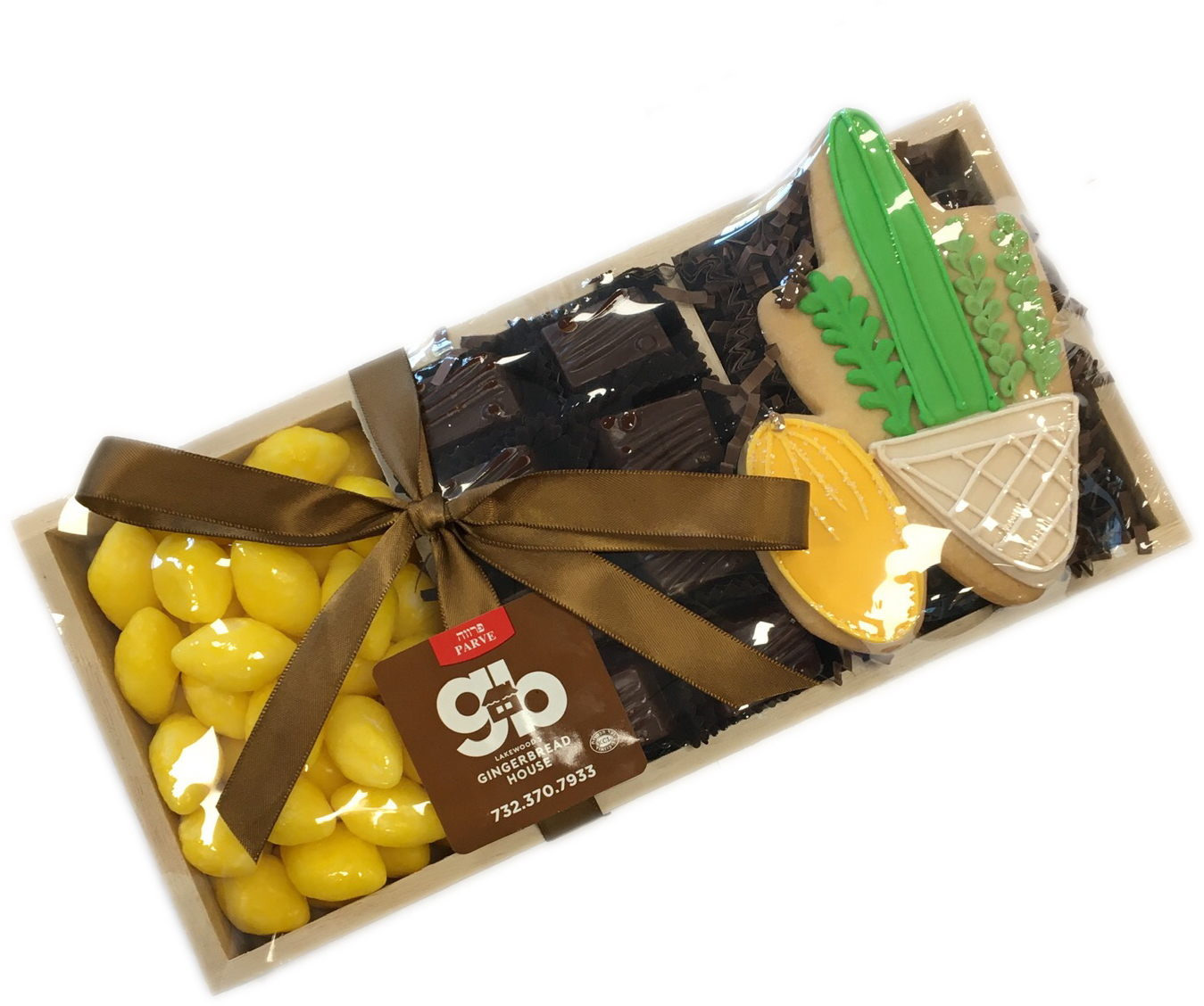 Three section wood tray contains: chocolate truffles, “esrog” candies, and lulav and esrog cookie.