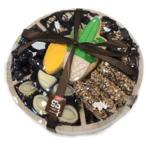 11×11 wood tray with delicious assortment of chocolates and nuts. contains: Viennese crunch, almond caramel clusters, honey glazed cashews, continental truffle and chocolate covered almonds.