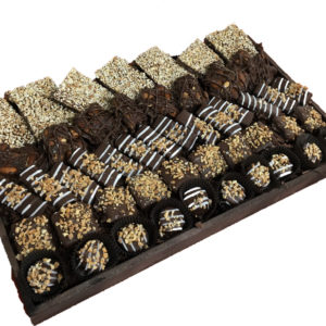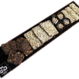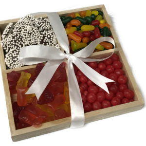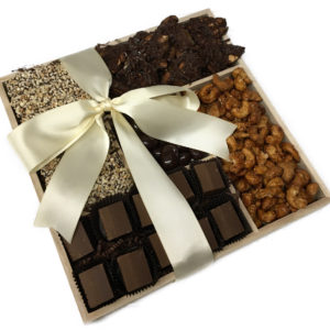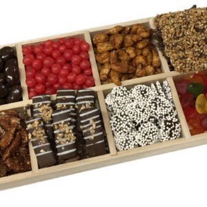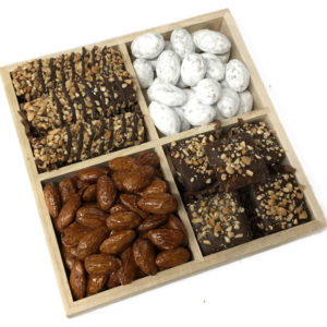 12×12 inch wood 5 section tray contains: Kosher for Passover Viennese crunch, almond bark, pecan clusters, torine blend bars, and coconut dessert.