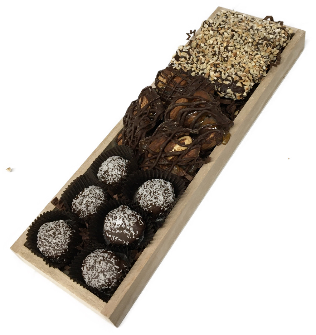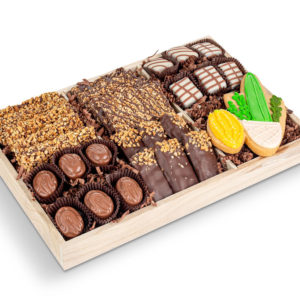 Perfect gift for a pre-pesach Simcha or for hostess! This 11×3 inch wood tray contains: Kosher for Passover Viennese crunch, almond/caramel clusters and coconut dessert truffles.