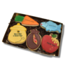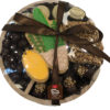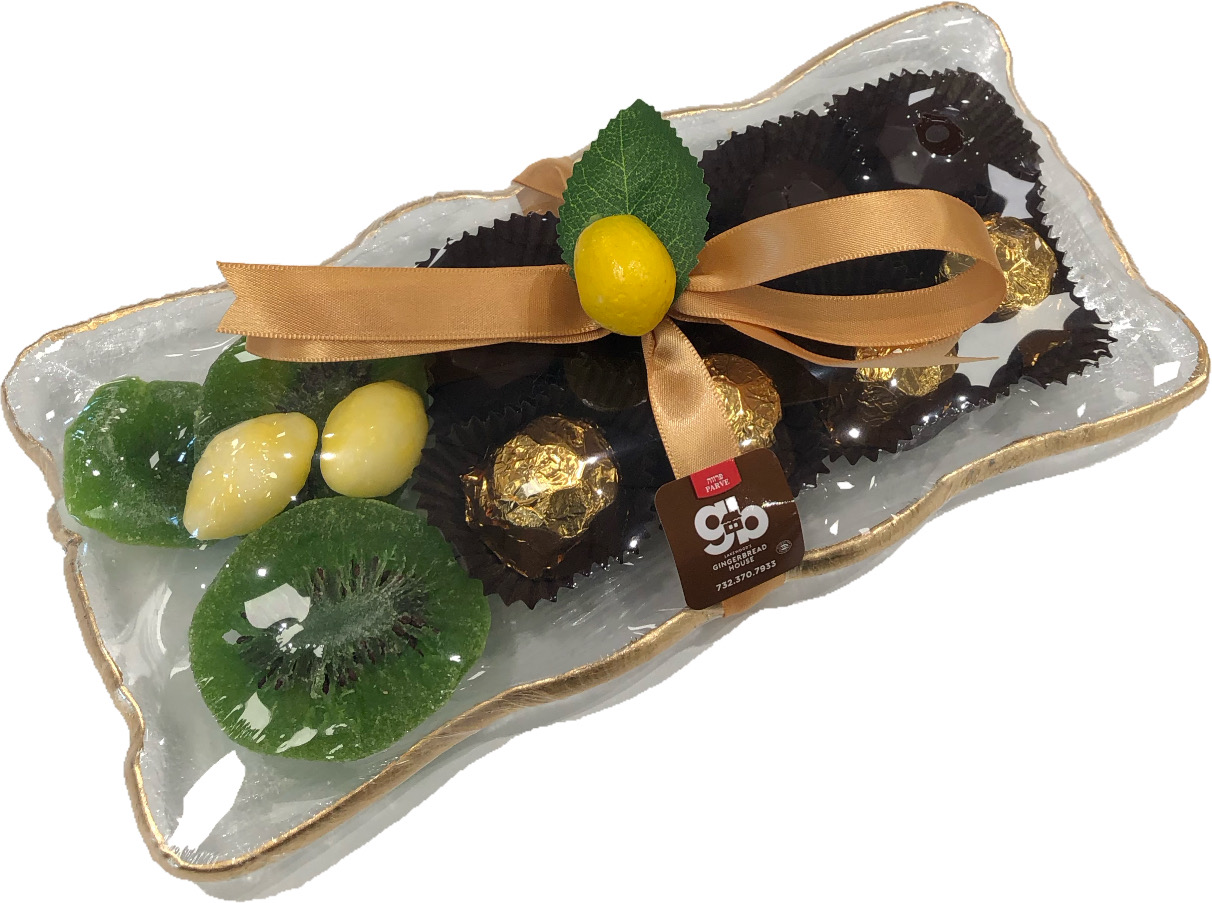 Glass tray with gold trim contains chocolates, viennese crunch and kiwi and “esrog” candy.