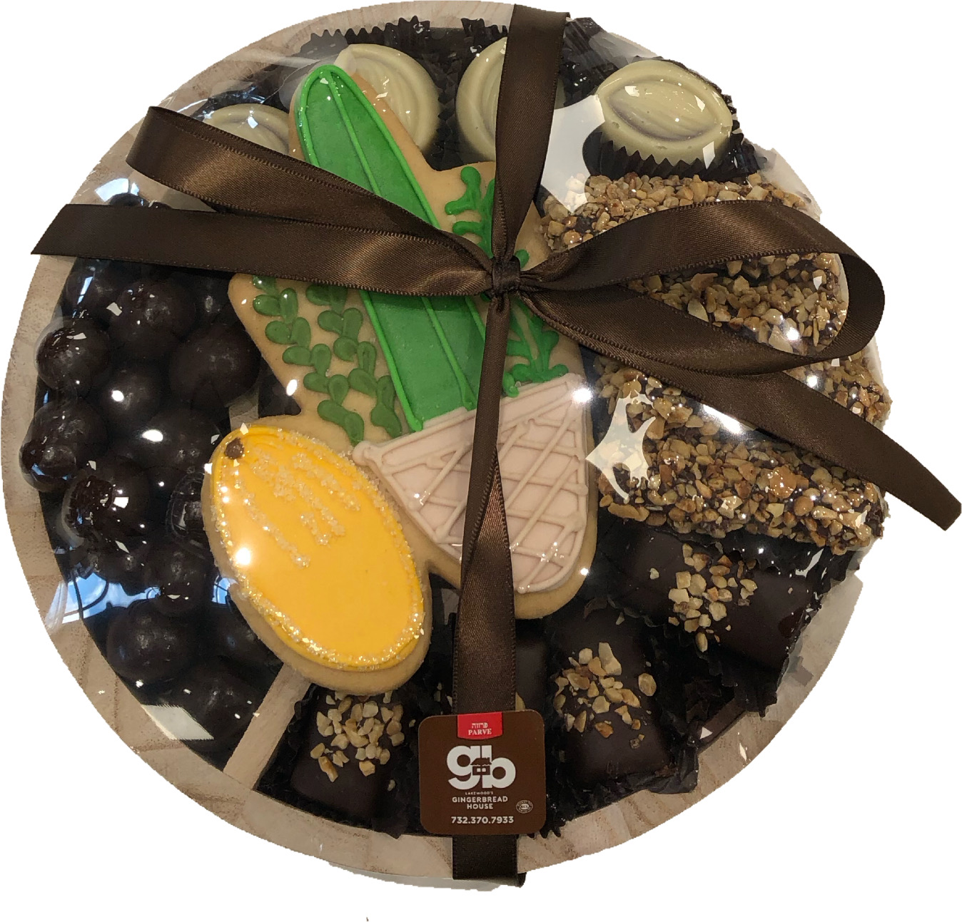 7 inch round wood tray contains chocolates and a special lulav and esrog cookie.